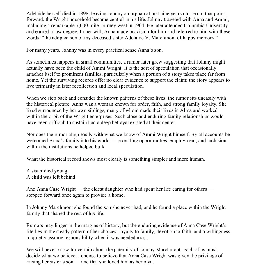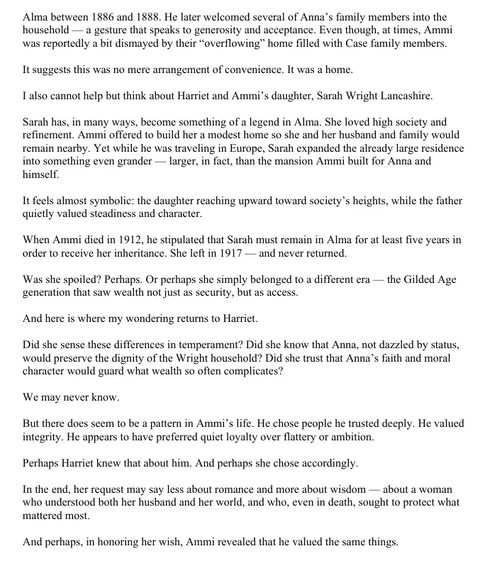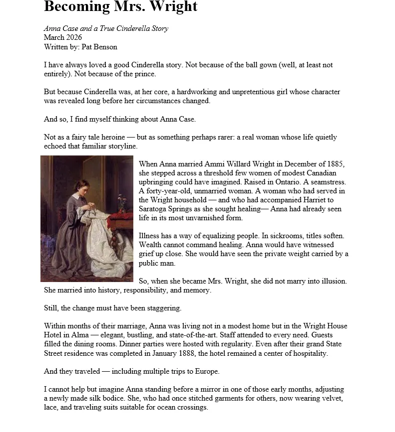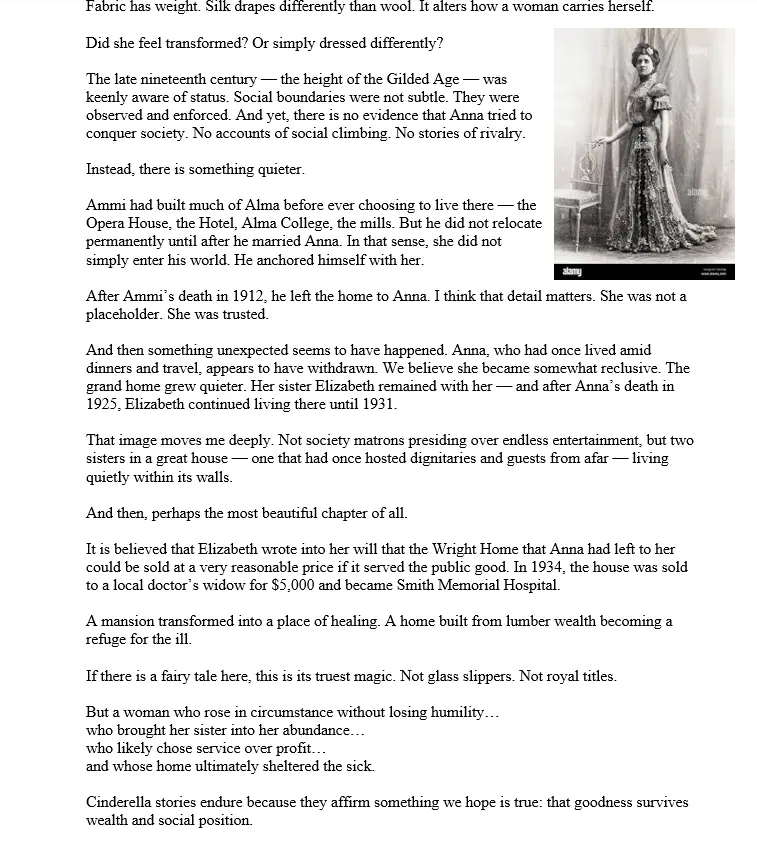 "So much can be gained by looking at our history. Whether looking at our own family tree or our history as a community. I have spent most of my life in Alma and learned some time ago that Mr. Ammi Wright had the greatest influence on the expansion of our city. I am so pleased that we are not only saving his wonderful 19th-century mansion but creating a place where our community family can see and touch some of our past."